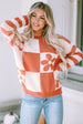 Brown Checkered Floral Print Striped Sleeve Sweater