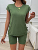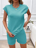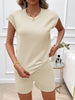 Feature: Woman two piece set crew neck short sleeve shorts with pockets solid color high quality lightweight fabric trendy casual leisure style suit for spring, summer, fall