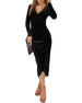 Made from a plush velvet fabric and boasting long sleeves, a plunge v neckline, a fitted bodice, and a playful wrap skirt with a ruched, split finish, this elegant midi Xmas dress is an effortless showstopper.